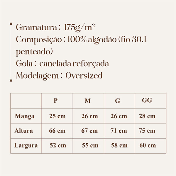 Nossas camisetas possuem modelagem oversized, ou seja, têm um caimento mais solto e alongado — exatamente o que traz o conforto e estilo característicos da Sōlum.